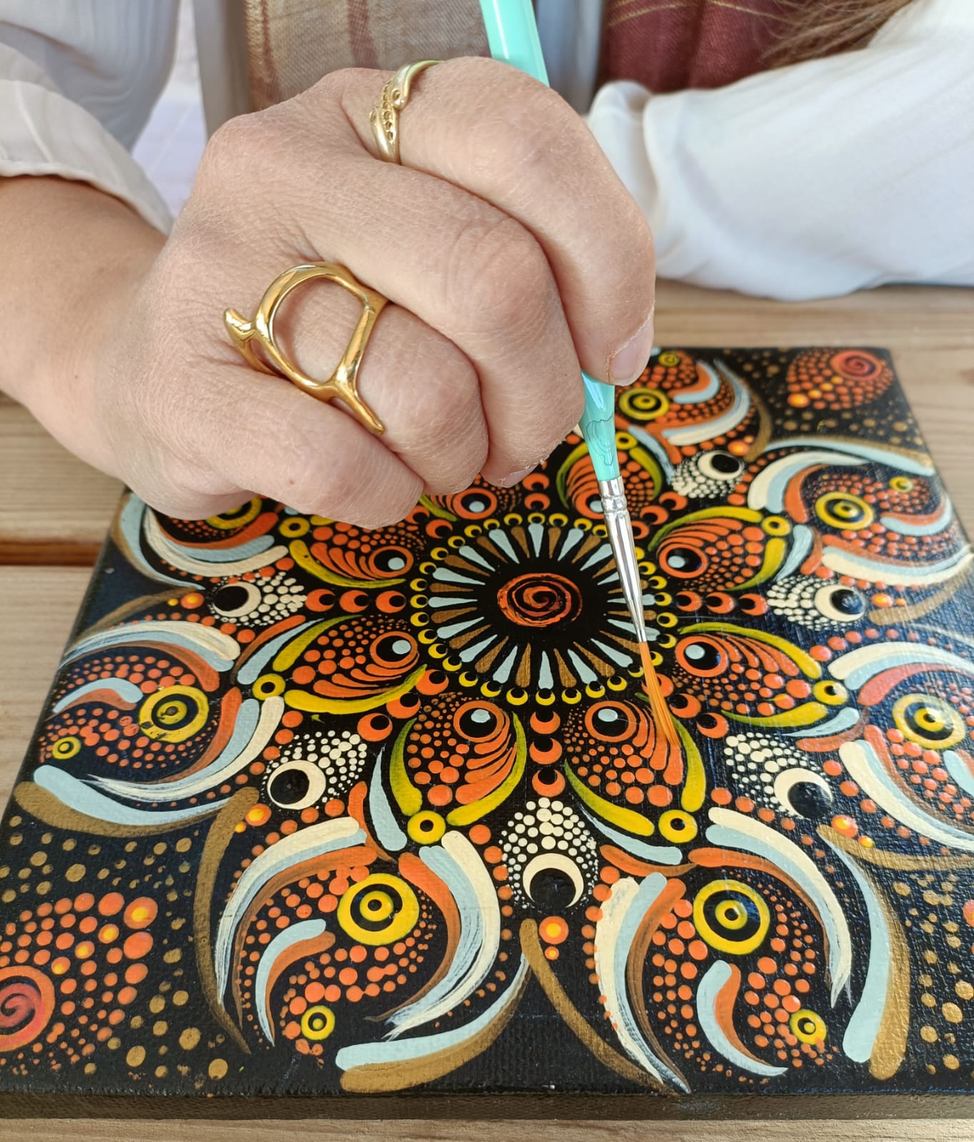 As a child with ADD, I often drew mandalas in class because they helped me focus. Gradually, this simple habit grew into a deeper form of expression. In recent years, creating dotted mandalas has become a calming and meditative practice. Moreover, it reconnects me to my creativity and intuition every time I paint.